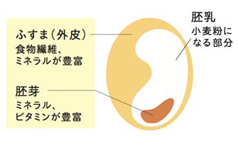 通常の小麦粉には「胚乳」の部分しか使われないのに対して、「外皮(ふすま)」や「胚芽」の部分も合わせた粉を「全粒粉」と言います。