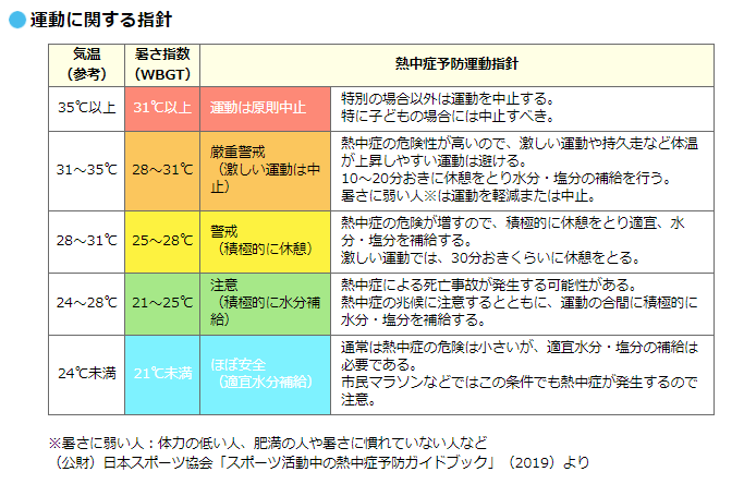 下記表を参考にすると、気温24℃以上で運動する場合は、特に注意が必要そうですね。暑い季節に運動する際は、積極的に水分・塩分を補給するように気をつけましょう。