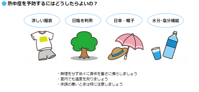 もちろん、上記以外に、日頃からの体調管理も重要です!睡眠やバランスのよい食事をとることも気をつけたいですね~。 気温と湿度に注意して、涼しい環境を維持するために、服装・日傘などのグッズ、冷房などで調整しましょう。